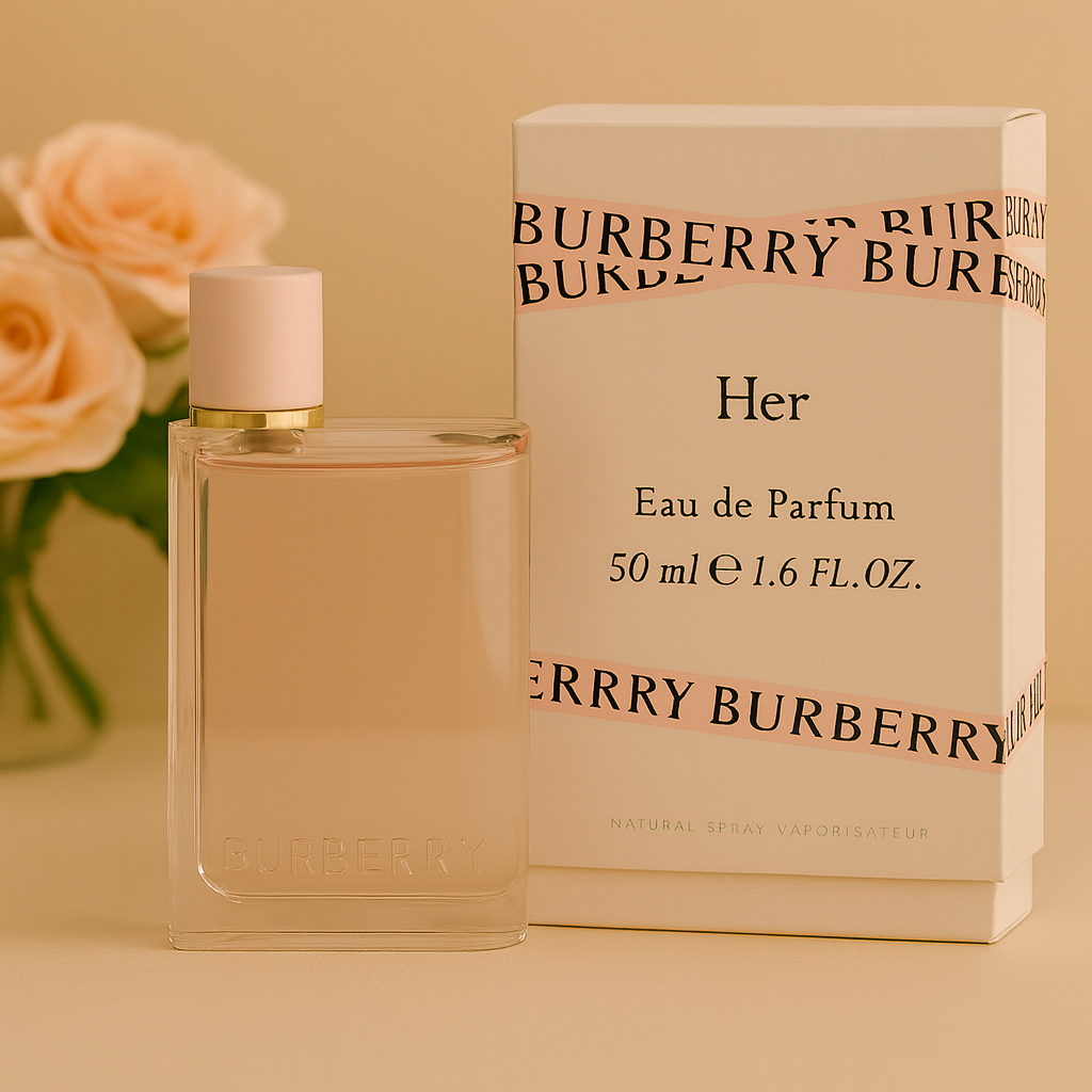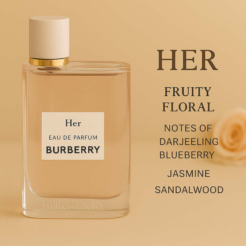 Burberry Her menghadirkan aroma Fruity-Gourmand dengan kombinasi stroberi manis, blackcurrant, dan vanilla lembut. Parfum ini menciptakan kesan muda, ceria, dan feminin. Dengan daya tahan lama, wewangian ini cocok dipakai sehari-hari maupun acara spesial.