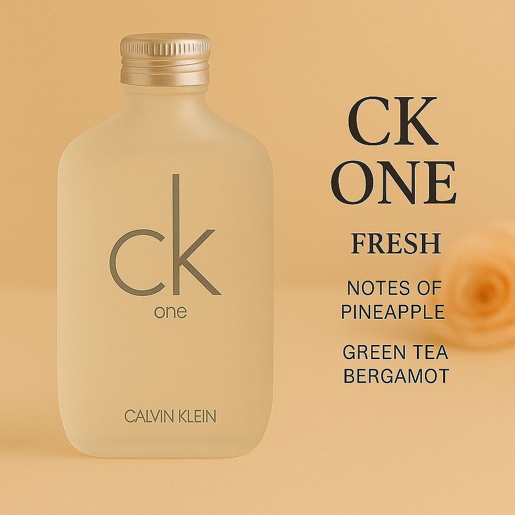 Calvin Klein CK One adalah parfum unisex ikonik dengan aroma citrus-aromatic segar. Kombinasi nanas, teh hijau, dan musk memberikan kesan bersih, ringan, dan energik. Cocok untuk pria dan wanita, ideal untuk pemakaian sehari-hari dengan ketahanan 6–8 jam.