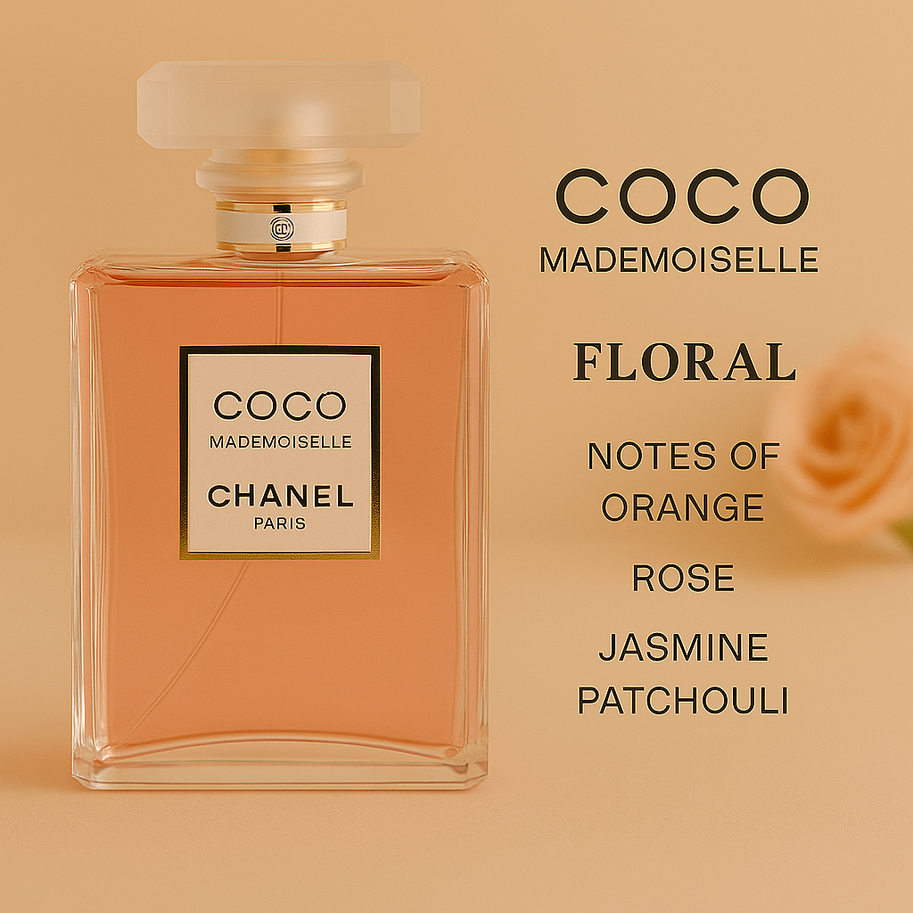 Chanel Coco Mademoiselle adalah parfum wanita klasik dengan aroma chypre-floral yang memadukan jeruk segar, mawar, dan patchouli hangat. Parfum ini memberikan kesan elegan, feminin, dan berkelas, cocok untuk siang maupun malam. Aromanya tahan lama sepanjang hari dengan konsentrasi Eau de Parfum.