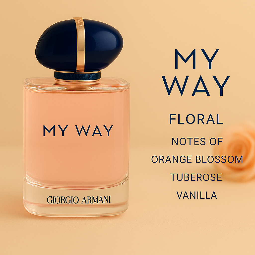 Giorgio Armani My Way adalah parfum wanita modern dengan kombinasi jasmine, orange blossom, dan vanilla hangat. Wangi floral manisnya memberikan kesan lembut, anggun, dan percaya diri. Aromanya tahan lama, cocok dipakai untuk siang maupun malam.